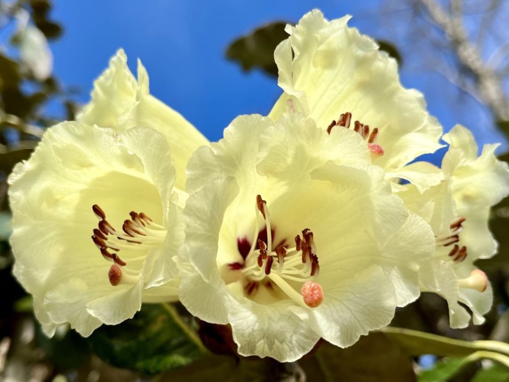 By March, attention turns skyward to our magnificent collection of mature magnolias as they burst into bloom. Among them are Magnolia kobus and Magnolia stellata, planted in the 1930s and still offering a breathtaking display each spring. Nearby, one of our oldest and largest specimens, Rhododendron macabeanum, first planted in the late 1920s, brings bright yellow flowers set against striking silver foliage.